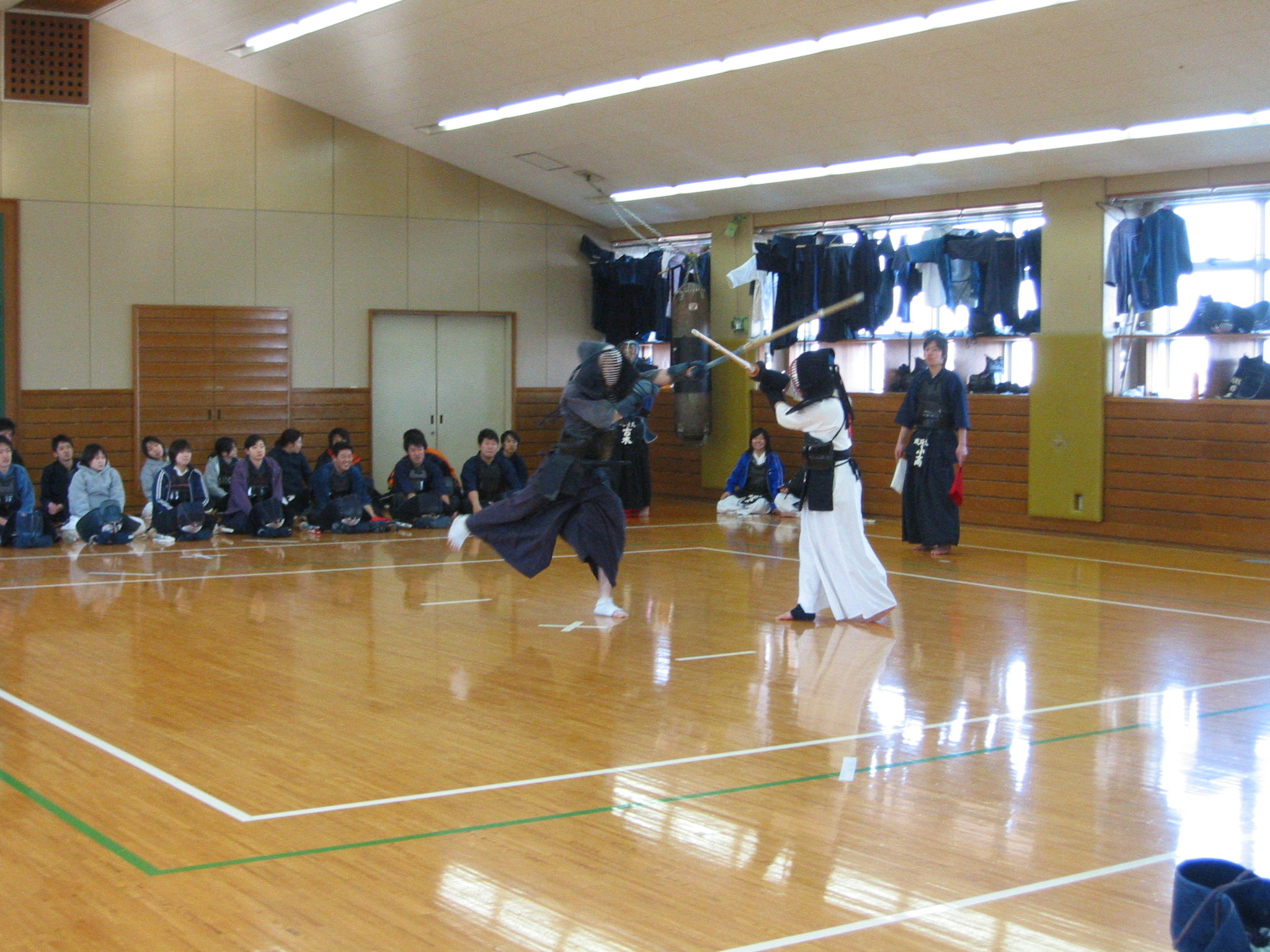 12時半より送別試合が4年生(6人)対1年〜3年で行われ、その後送別稽古になりOB、OG,師範の青木先生を交えて行われた。