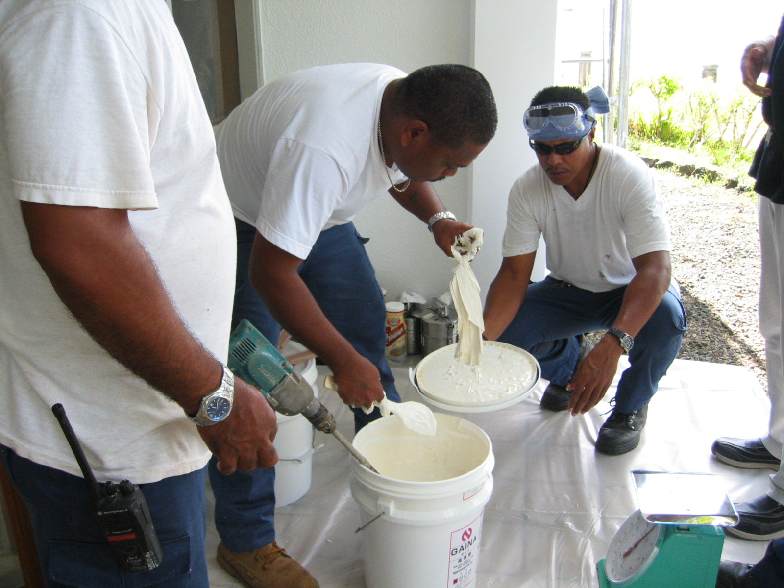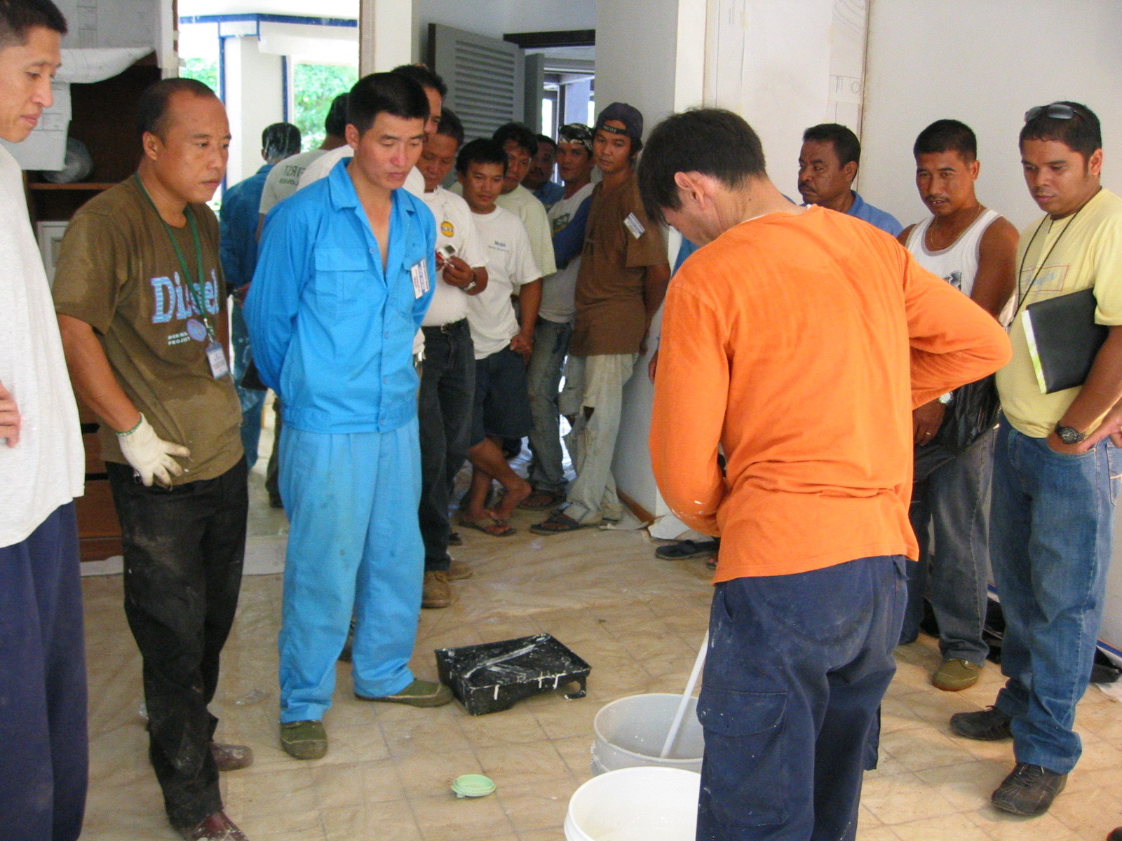 中国人、フィリッピン人主体の今回のメンバーにメーカーのA氏が実演をしながら指導するが、なかなか身が入らない。ペンキを塗ればいいのだろうという程度にしか考えていない。何度も何度も「ガイナ」の特性を説明し、パンフレットを見ておくように伝えるが、話が終わるとパンフレットはその辺に投げ出して手に取ろうとしない。これは厄介だぞ。
