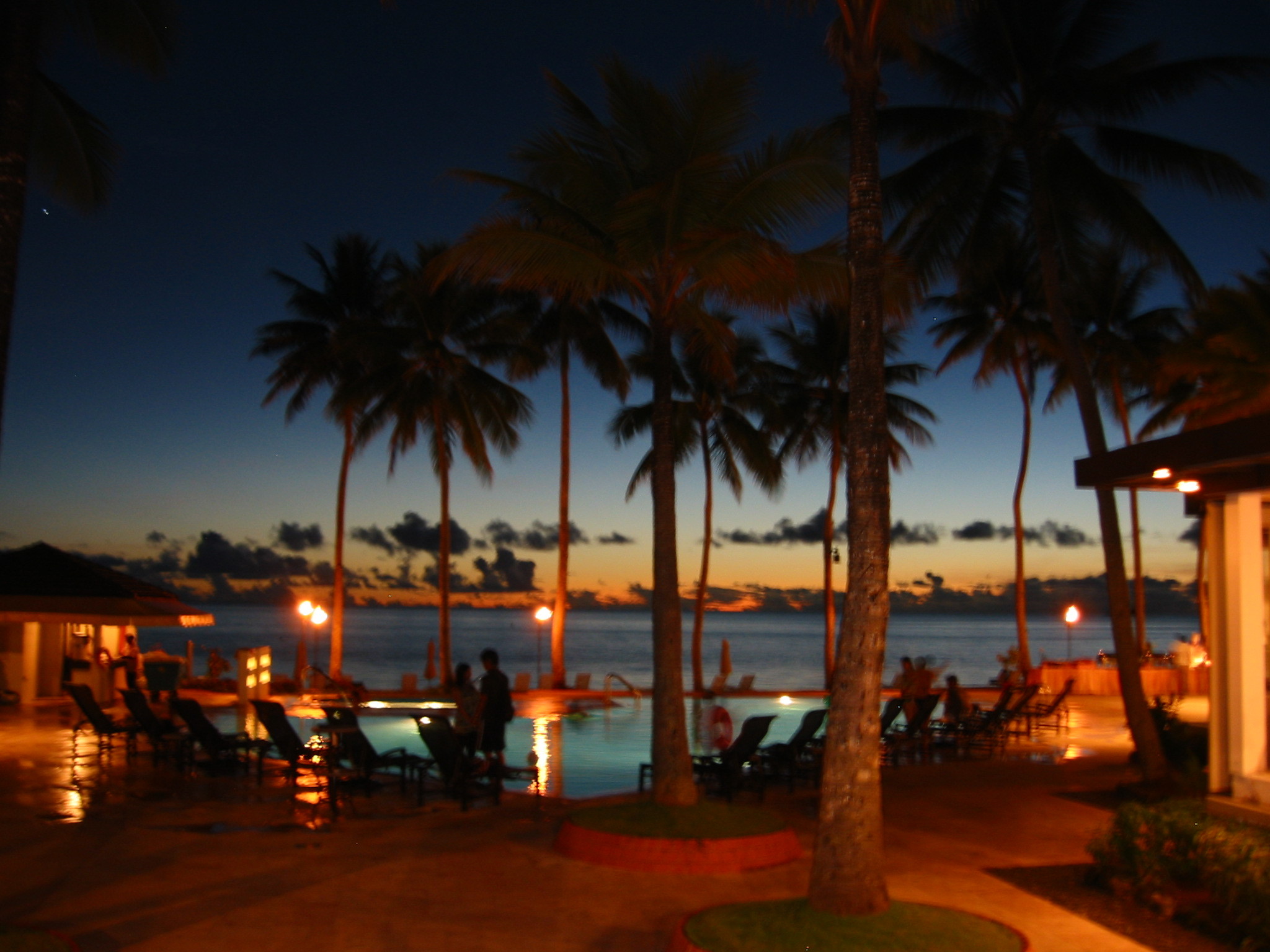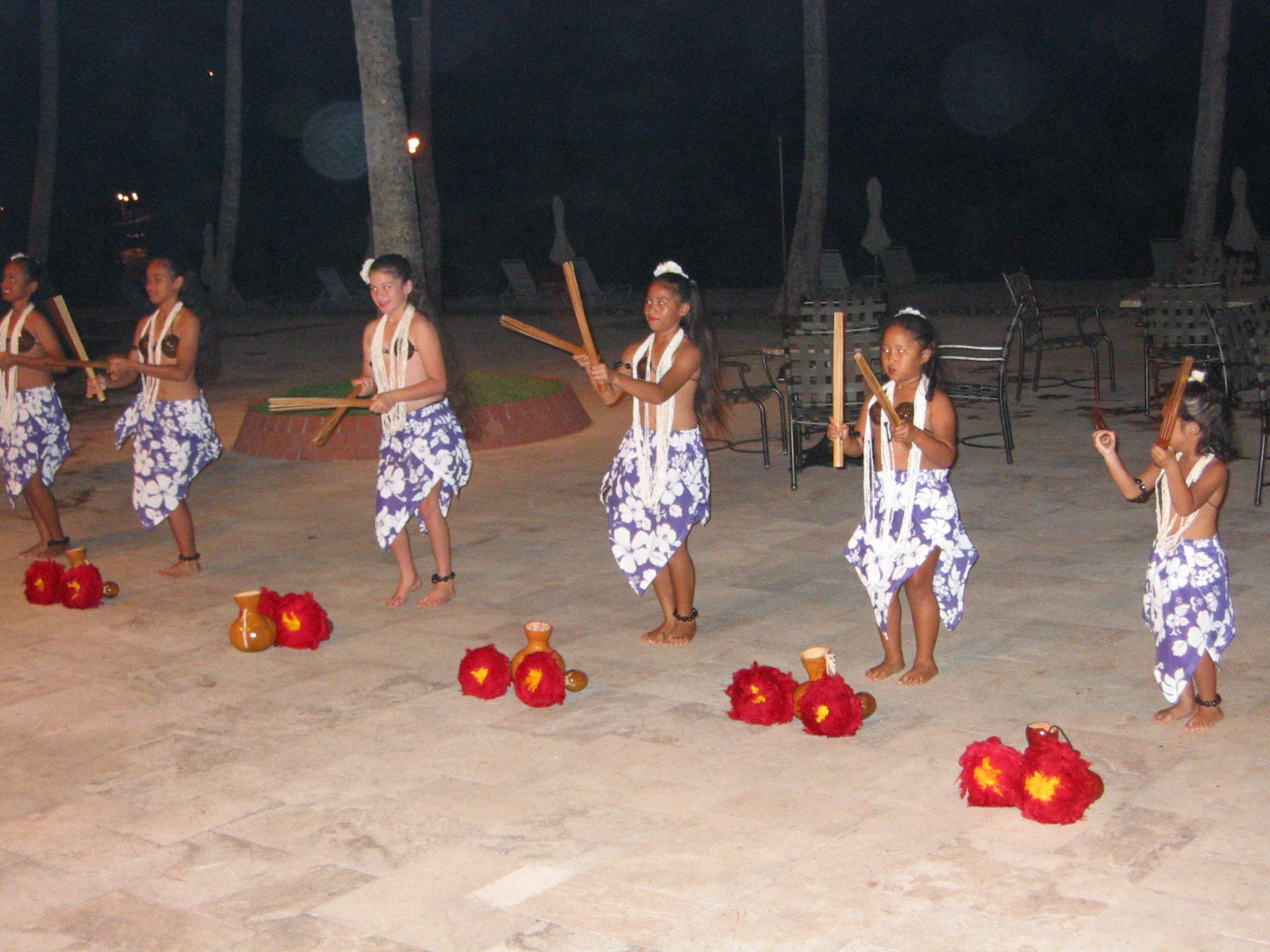 シャワーを浴びてレストランへ行くと、すでにプールサイドの席はお客様でいっぱいである。今日のポリネシアンダンスがお目当てなのだろう。私達はPPRのT氏、S氏とともに少し奥の席に陣取る。南国の料理を注文し、ビールを飲み始めるとポリネシアンダンスが始まった。6歳くらいの女の子から20歳くらいの女性までが踊りを披露する。昨年は浜辺で勇壮な男性の踊りを見学したが、それとは対照的に南国情緒漂う優しい踊りである。ダンスも佳境に入り、我々も酒がまわってきた頃、見学者が次々に誘われてダンスに参加しだした。私達も背中を押されるようにダンスの輪に入り見様見真似で踊りに参加した。