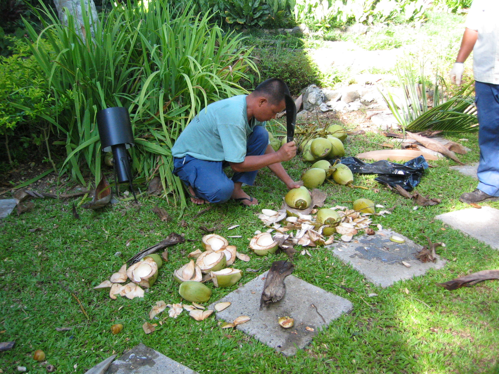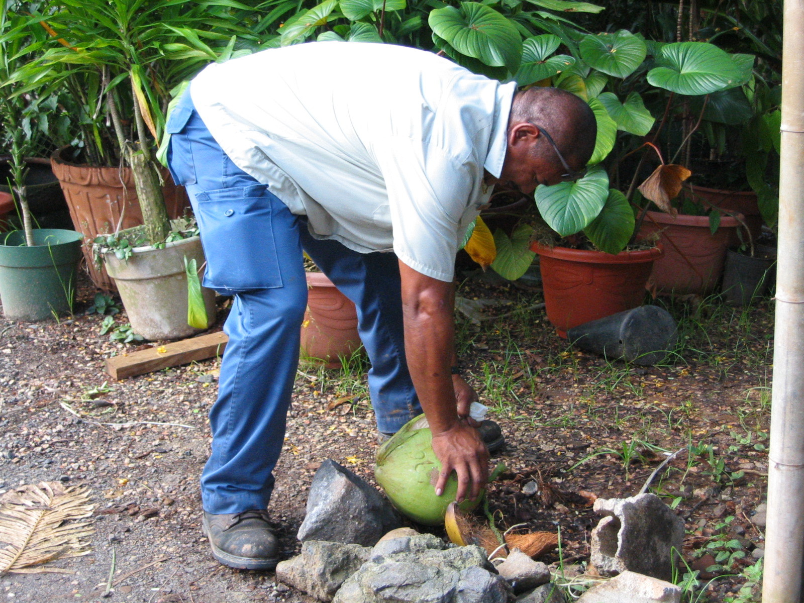 午後、今回のチームが全員揃い記念撮影をする。記念写真の後、椰子の実割の名人がPPRにいるというので、案内される。パラオでは椰子の実を割る競技があるそうで、そこのチャンピオンになったこともある人だという。