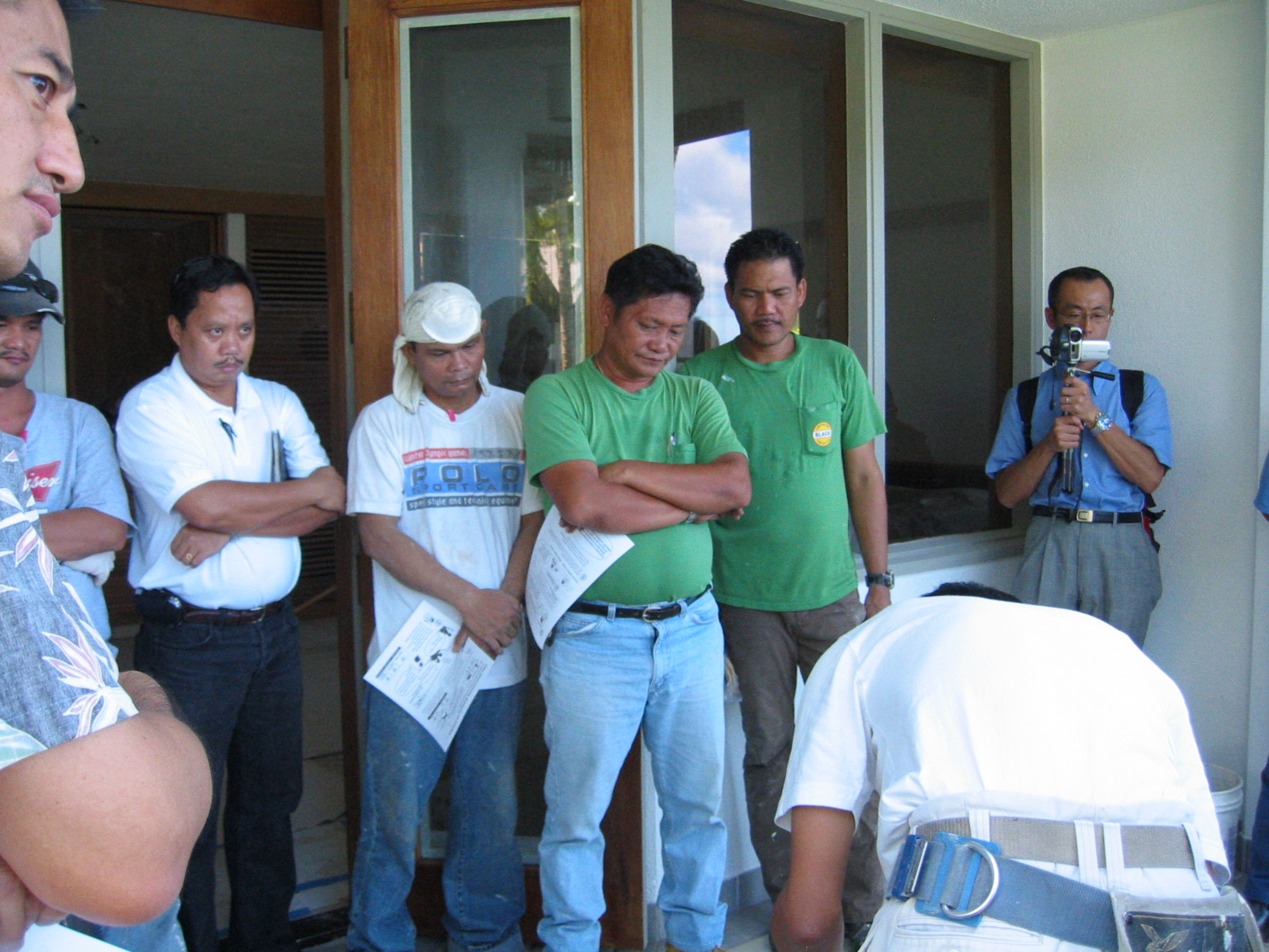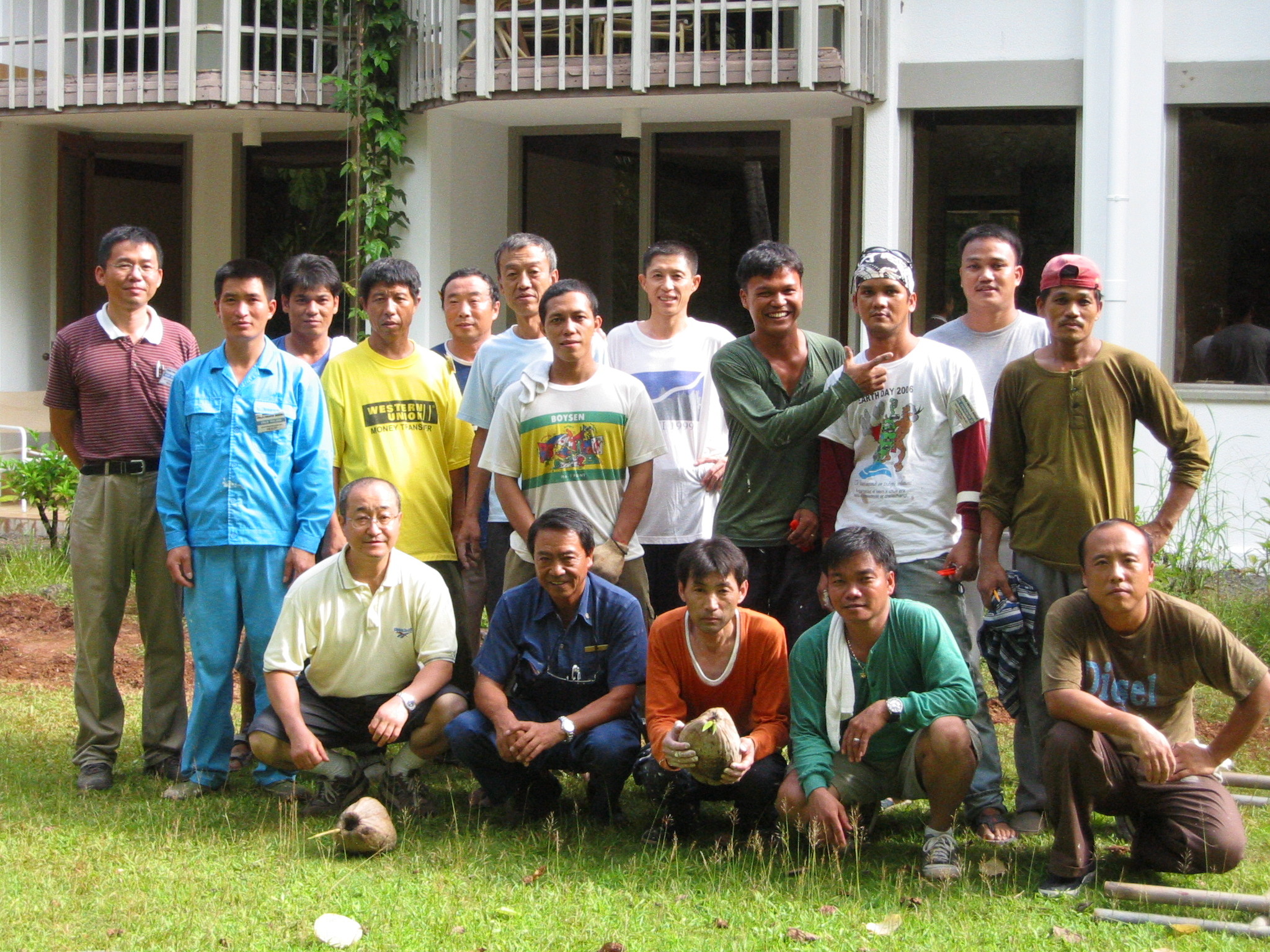 南国の朝は早い。朝5時30分に目が覚める。外は大雨が降っている。雨音が部屋の中まで聞こえてくる。しかし、6時30分にレストランへ行くころには雨は嘘のように上がった。朝食後8時30分にクラスター8行き、「ブラック」(前回施工したチーム)、「NECO」(今回施工するチーム)ともに集めて再度A氏に説明をしてもらう。A氏も職人気質のところがあり、だらだらしている今回のチームに苛立ちを隠せない。