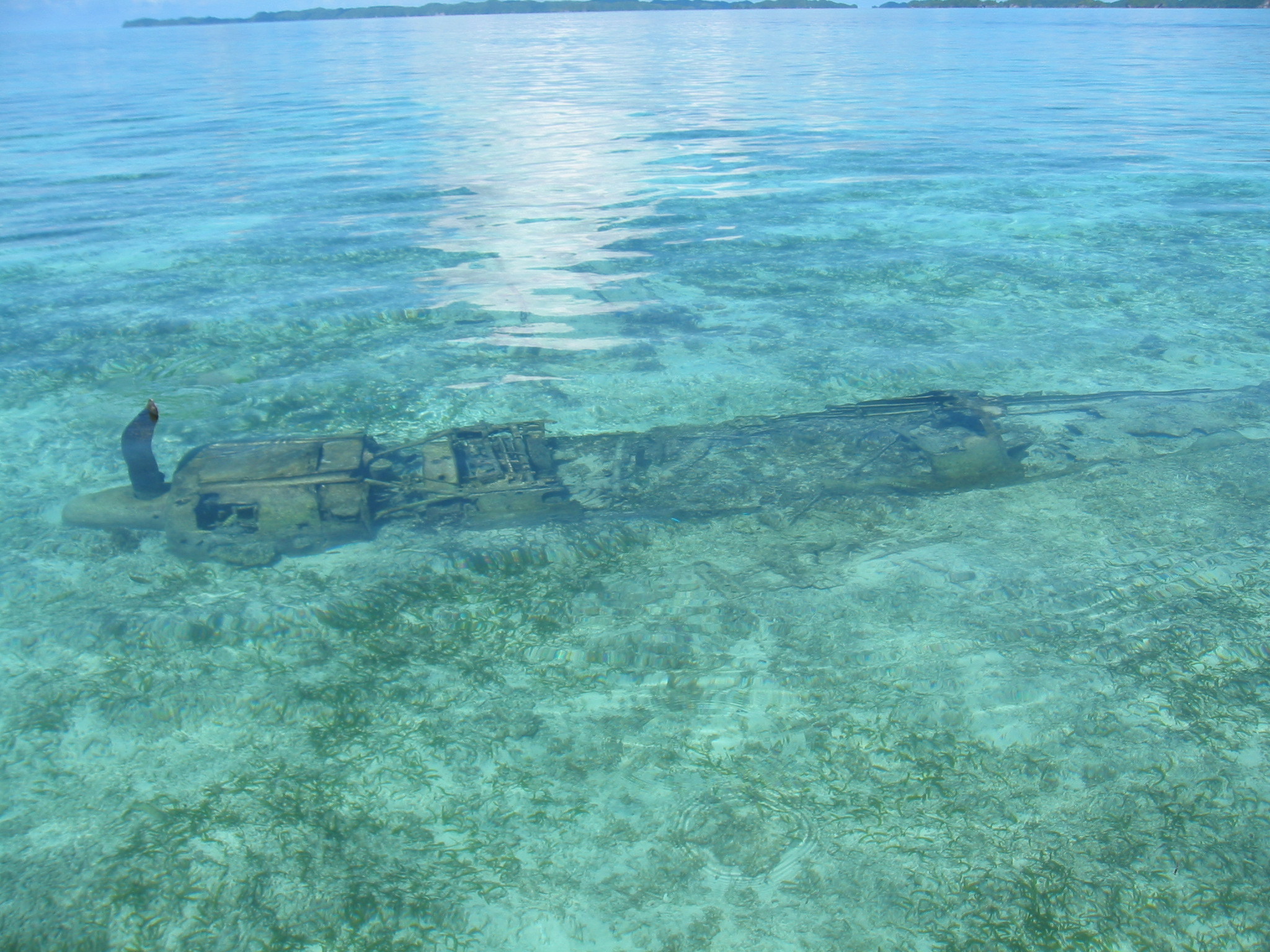 昼食後一休みしてボートに乗り込み、シュノーケリングでさんご礁と南国の魚達を楽しむことにする。ボートでさんご礁が美しいという場所に移動し、海に入り海底を覗き込む。この美しいさんご礁や魚の群れの中に墜落した戦闘機は、操縦士は・・・とつい脳裏を過ぎってしまう。先ほどの浅瀬に沈んでいたゼロ戦を思い出す。戦争博物館に展示されるより、よほど強烈な印象を与える。ありのままということはそういうことなのかとつくづく考えさせられた。