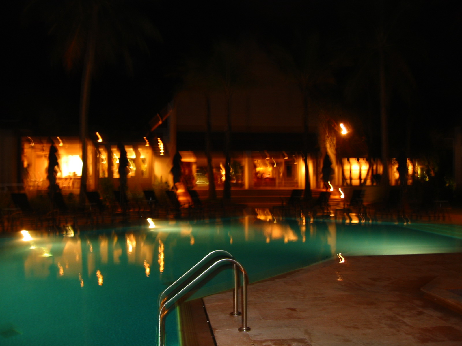 プールには篝火が焚かれて幻想的である。酔いが回っていい気分である。しばらくプールサイドのリクライニングシートに横になり海を眺める。