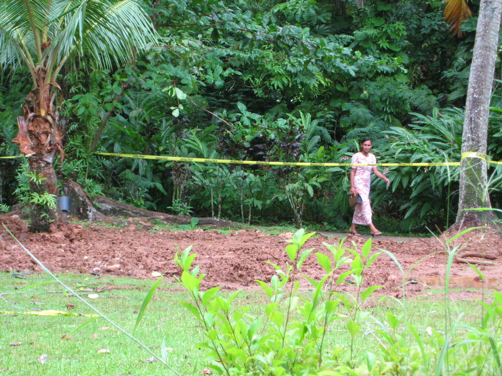 昼食休みも終わり、今回施工の8クラスターへ向かう。今回の場所はガーデンビューで部屋から海は見えない。目の前は熱帯雨林特有の木々がジャングルのように迫っている。湿度は80%を超え大変蒸し暑い。天気がよくても突然スコールになり、また、青空が見えてくる。