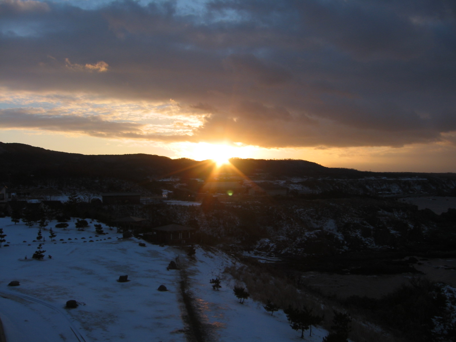 翌朝、朝日を見に再び露天風呂へ向う。昨日は雪のため夕日を楽しめなかったので、今日は朝日を拝むつもりだ。幸い今日は昨日とうって変わって天気がいい。東の空が白み始めたかと思うと山間からスーと一筋の赤い光が放たれた。日の出だ。久しぶりに朝日を拝む。