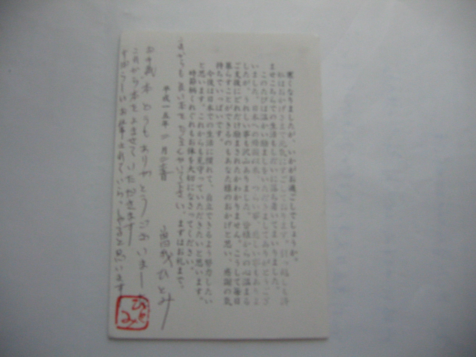 このたびは温かい励ましをいただきましてありがとうございました。日本への帰国以来、つらい事、悲しい事もありましたが、うれしい事も沢山ありました。皆様からの心温まるご支援にどれだけ励まされたかわかりません。こうして毎日暮らすことが出来るのもあなた様のおかげと思い、感謝の気持ちでいっぱいです。